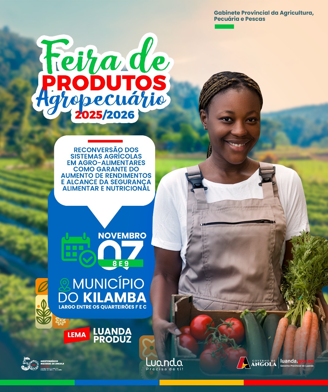 Em simultâneo vai acontecer a *FEIRA DE PRODUTOS AGROPECUÁRIO*, Sob lema: *LUANDA PRODUZ* nos dias 7, 8 e 9 de Novembro, Largo entre os Quarteirões F e C, Centralidade do Kilamba.